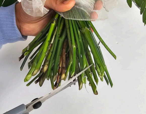 Carefully trim all stems at a 45-degree angle to help them stay fresh and allow maximum water absorption before packaging.