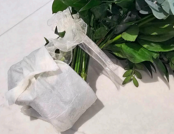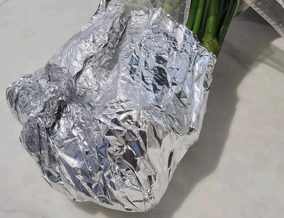 Wrap a layer of foil around the damp paper towel and stems to lock in moisture and keep your flowers fresh during transit.