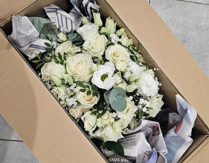 Place your flowers gently in the centre of the box and surround them with scrunched-up newspaper or tissue paper to keep them snug and secure during transit.