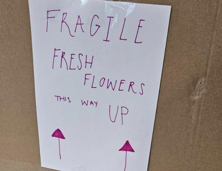Write a second note that reads “Fragile – Fresh Flowers – This Way Up” and attach it to the outside of your box to ensure it is handled with care during transit.